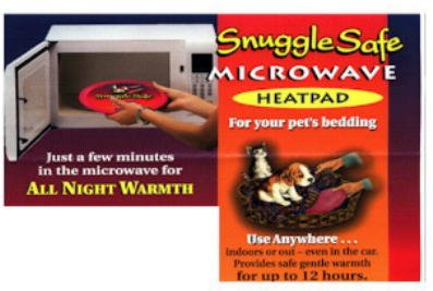 SNUGGLE SAFE MICROWAVE HEAT PAD with cover. Six minutes in an 800 watt microwave provides all the heat of a regular hot water bottle for up to 12 hours The constant heat plateau of 96.8F(52C) is about 5 hours The disk is bite resistant. Ideal for newborn, convalescing and elderly pets. Assorted color cover included. Made in the United Kingdom